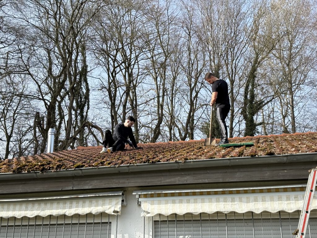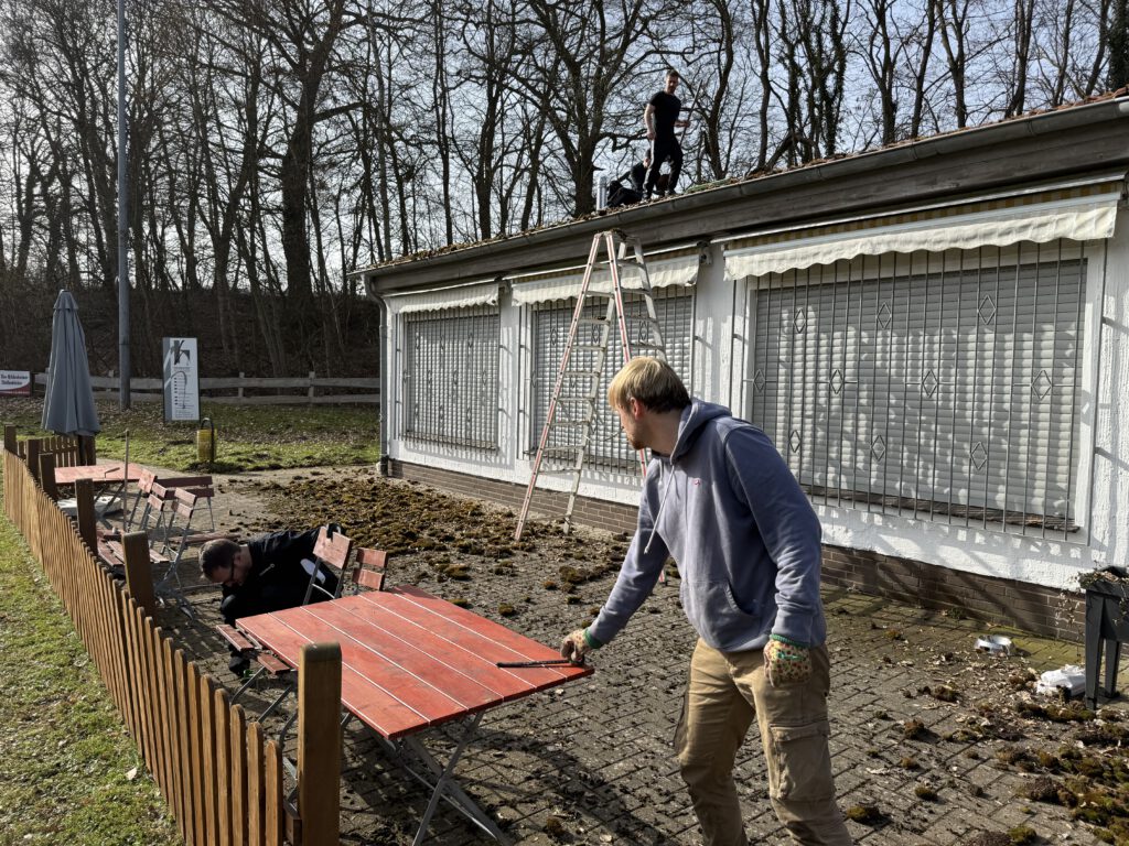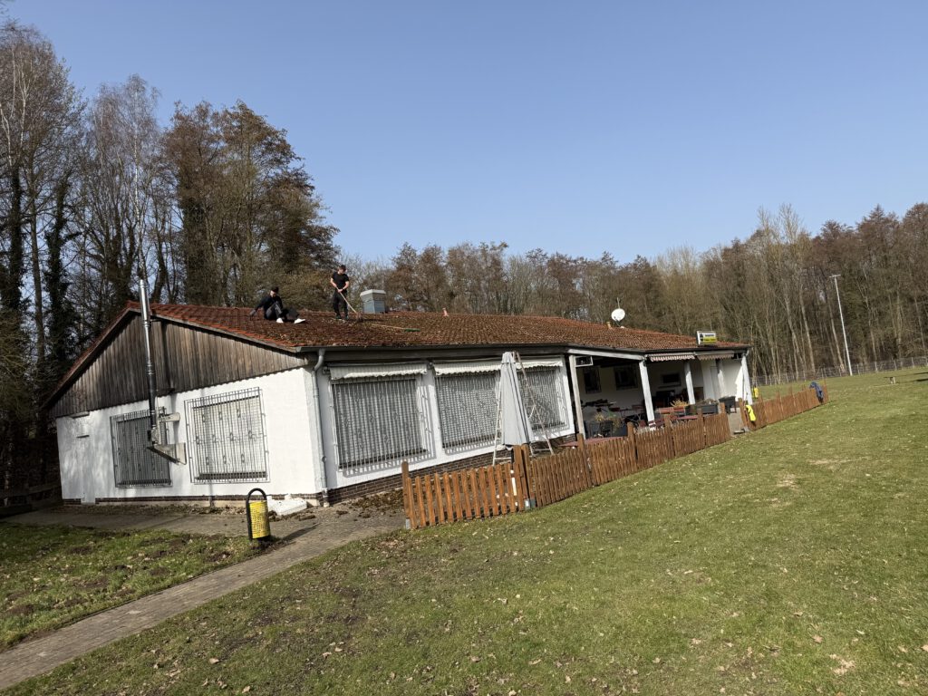 Aber schon gestern trafen sich einige Spieler der Herren- und Seniorenmannschaften, Verantwortliche und die Platzwarte in den Sundern um unsere wunderschöne Anlage für die Rückserie bereit zu machen. Schon um 09:00 Uhr in der Früh trafen wir uns mit schwerem Gerät und bekamen die Aufgaben zugeteilt. In Kleingruppen wurde das Dach des Clubhauses vom Moos befreit, das Unkraut auf den Wegen entfernt und die Kanten begradigt. Bänke wurden geschliffen, geputzt und gestrichen.