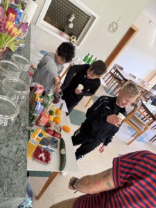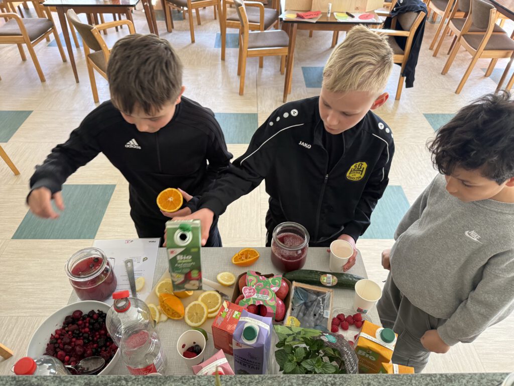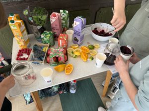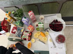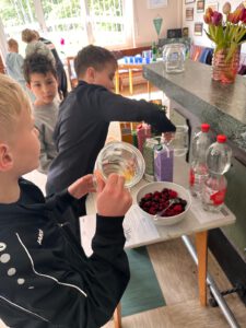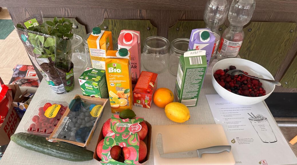 An diesem Tisch durften die Teilnehmer ihrer Kreativität freien Lauf lassen und sich aus den vorhanden Lebensmitteln einen eigenen Durstlöscher kreieren. Zu den Lebensmitteln gehörten Orangen, Limetten und Zitronen, Minze, verschiedene Säfte, tiefgekühlte Beeren und vor allen Dingen Wasser. Hier hatten vor allen Dingen die Kinder am meisten Spaß und brachten wirklich lecker Kreationen zustande.