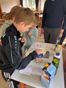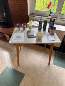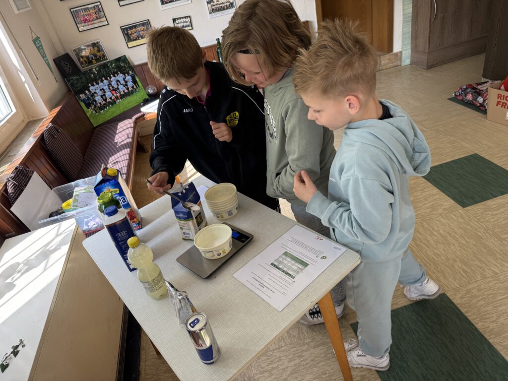 An dieser Station mussten die Teilnehmer zunächst den Zuckergehalt verschiedener Getränke anhand der Nährwerttabelle auf der Verpackung ermitteln. Anschließend sollte diese Menge Zucker in eine Gefäß abgewogen und dem Getränk zugeordnet werden. Dabei sind beeindruckende Werte herausgekommen. Zum Beispiel, dass Fruchtsaft ähnlich viel Zucker wie Cola hat. Also müssen auch Fruchtsäfte in Maßen genossen werden.